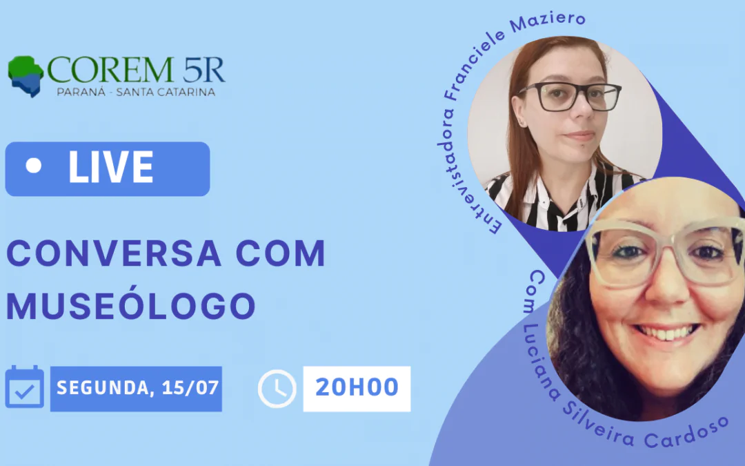 O COREM 5R convida a todos para assistir a live CONVERSA COM MUSEÓLOGO, que será realizada no dia 15 de julho, com a presença da convidada Luciana Silveira Cardoso, museóloga que atuou como Diretora do Museu de Arqueologia e Etnologia Oswaldo Rodrigues Cabral – MArquE, Museu Universitário da Universidade Federal de Santa Catarina/UFSC, gestão 2018-2021.